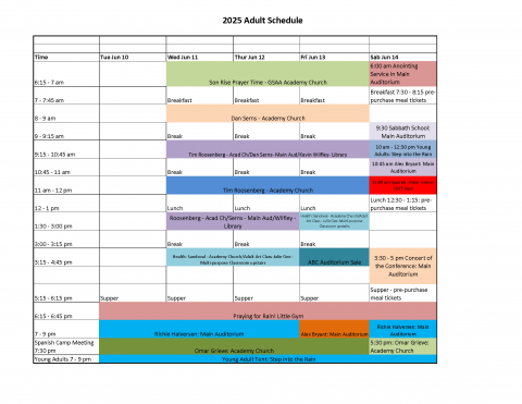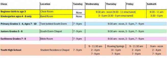 The Young Adults will be meeting in the tent in the southeast corner of the academy grounds. They will meet nightly and on Sabbath. Come and enjoy good music, inspiring messages and meet new friends! Step into the Rain!